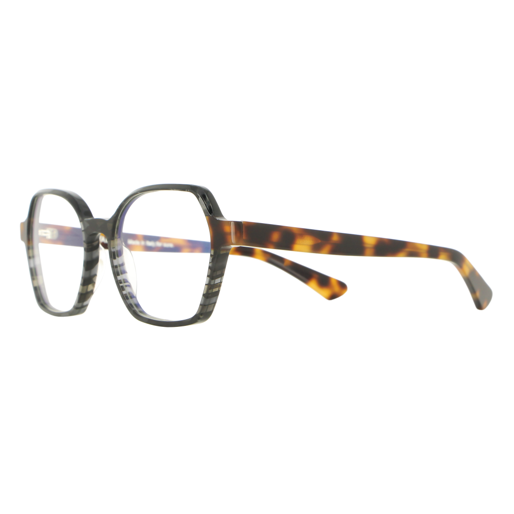 Occhiali da vista in acetato, color dama nero e aste havana. Un'opera di ingegno in cui forme, fantasie e colori vengono sapientemente dosati per rendere ogni occhiale significativo e senza tempo per superare le mode passeggere.