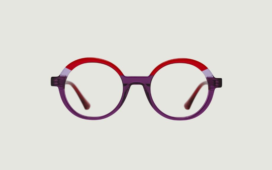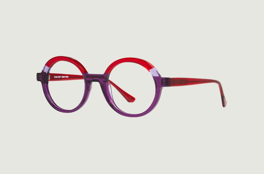 Questi occhiali da vista di Xavier Garcia Barcelona, modello Turquesa, sono di colore rosso, viola e lilla trasparente sul frontale con aste di colore rosso trasparente.