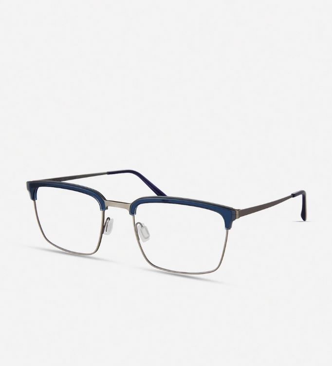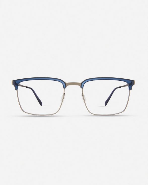 Occhiali da vista in acetato blu e titanio grigio sottile e leggero, dalla forma squadrata con aste in titanio.